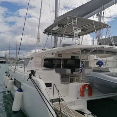 Available in Athens, Greece: Lagoon 450F 2014. This stunning vessel offers 4 double cabins, 4 heads, and is equipped with a generator, watermaker, and air conditioning for unparalleled comfort at sea.
